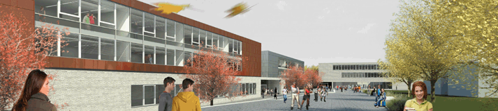 visualisierung gesamtschule : Wettbewerbs-Visualisierung für den Neubau der IGS Wilhelm Bracke in Braunschweig im Auftrag für HTP Architekten. Innen- und aussenräumliche Darstellung des dreigeschossigen Schulgebäudes: Sockelgeschoss aus hellem, massivem Sichtmauerwerk, Klassen-Units mit kupfer- und anthrazitfarbener Blechfassade als Stehfalzdeckung, begrünte Innenhöfe mit raumhoher Verglasung (Foyerzonen).