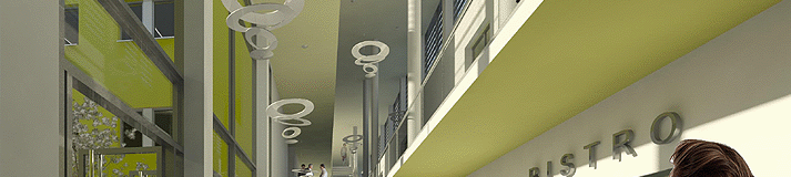 Innen- und aussenräumliche 3d-Darstellung des dreigeschossigen Gebäudes. Mehreschossige Eingangshall mit Vollverglasung zu den terrassierten Innenhöfen, Sonnenschutz aus Lamellen, Fassade aus anthrazitfarbener Aluminiumwelle und farblich akzentuiertem WDVS.
